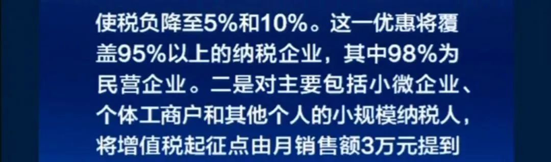 2. 對主要包括小微企業、個體工商戶和其他個人的小規模納稅人,將增值稅起征點由月銷售額3萬元提高到10萬元。
