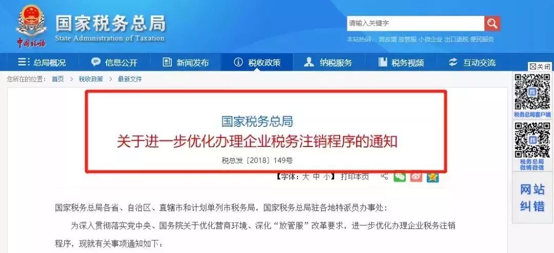 早在去年9月份,國家稅務總局就發布了《關于進一步優化辦理企業稅務注銷流程的通知》(稅總發[2018]149號),《通知》明確2018年10月1日起,企業注銷流程大大簡化!
