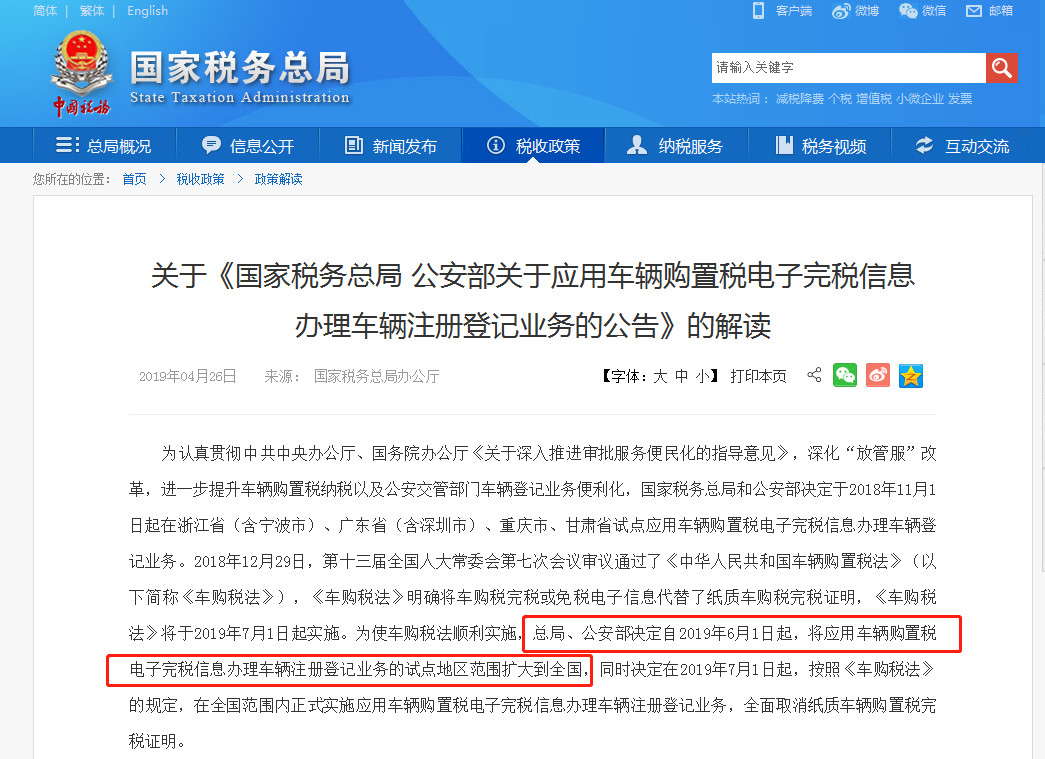 2018年12月29日,第十三屆全國人大常委會第七次會議審議通過了《中華人民共和國車輛購置稅法》(以下簡稱《車購稅法》),《車購稅法》明確將車購稅完稅或免稅電子信息代替了紙質車購稅完稅證明,《車購稅法》將于2019年7月1日起實施。為使車購稅法順利實施,總局、公安部決定自2019年6月1日起,將應用車輛購置稅電子完稅信息辦理車輛注冊登記業務的試點地區范圍擴大到全國,同時決定在2019年7月1日起,按照《車購稅法》的規定,在全國范圍內正式實施應用車輛購置稅電子完稅信息辦理車輛注冊登記業務,全面取消紙質車輛購置稅完稅證明。
