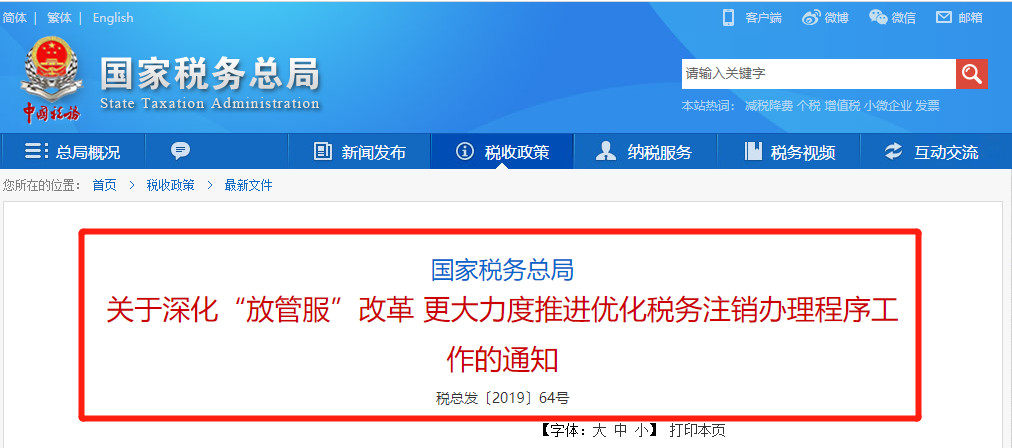 更大力度推進優(yōu)化稅務(wù)注銷辦理程序,是進一步貫徹落實黨中央、國務(wù)院關(guān)于深化“放管服”改革、優(yōu)化營商環(huán)境要求的重要舉措。各地稅務(wù)機關(guān)要高度重視,抓好落實,并嚴(yán)格按照法律、行政法規(guī)規(guī)定的程序和本通知要求辦理相關(guān)事項。