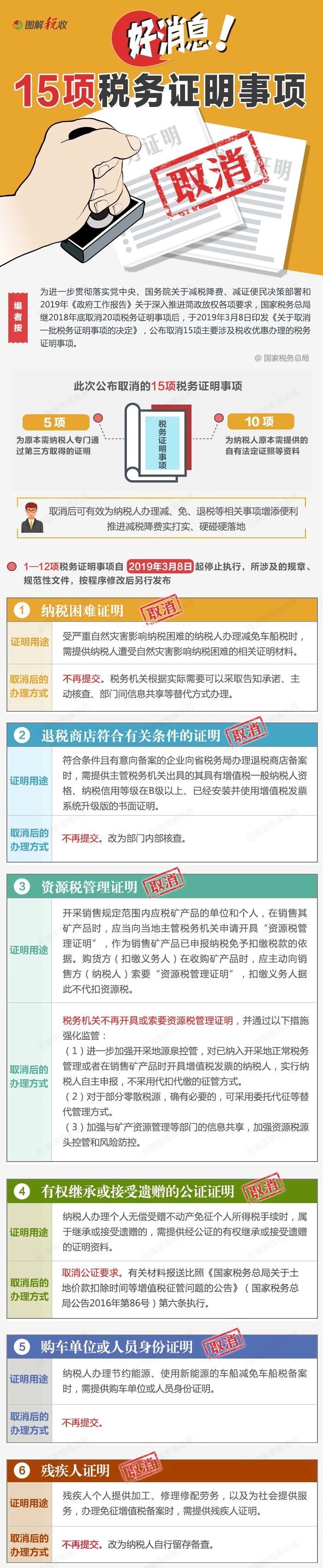 此次公布取消的15項稅務(wù)證明事項,有5項屬于原本需納稅人專門通過第三方取得的證明,其余10項是納稅人原本需提供的自有法定證照等資料。