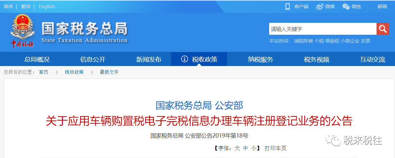 七、本公告自2019年6月1日起施行,《國家稅務(wù)總局、公安部關(guān)于試點應(yīng)用車輛購置稅電子完稅信息辦理車輛登記業(yè)務(wù)的公告》(國家稅務(wù)總局 公安部公告2018年第49號)同時廢止。