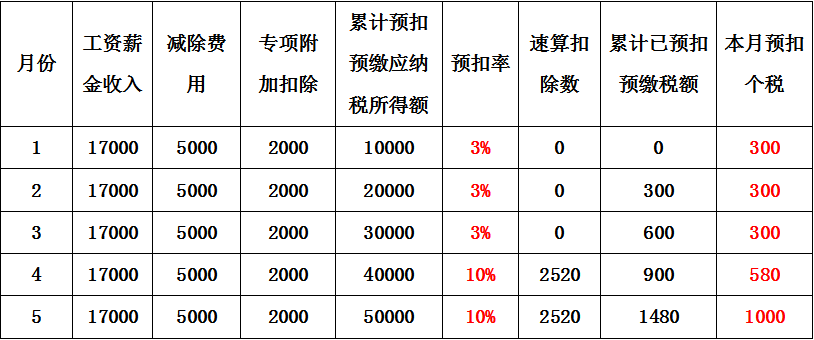 2019年甲某每月扣除“三險一金”后工資薪金收入17000元,減除費用5000元/月,專項附加扣除2000元/月,不考慮影響稅額計算的其他因素,無免稅收入。計算A公司2019年1-5月預扣甲某個稅稅額。