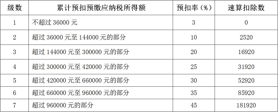 預扣率、速算扣除數,按《個人所得稅預扣率表一(居民個人工資、薪金所得預扣預繳適用)》執行。