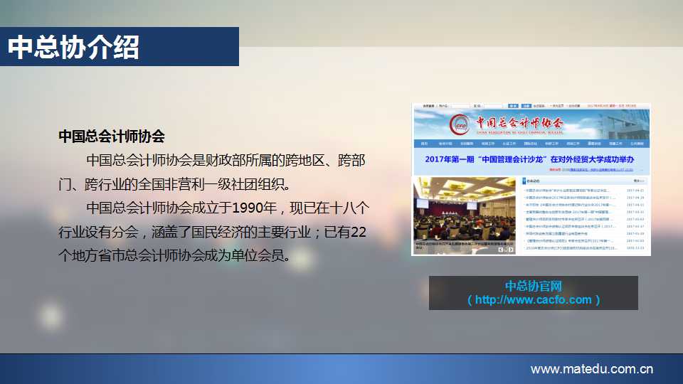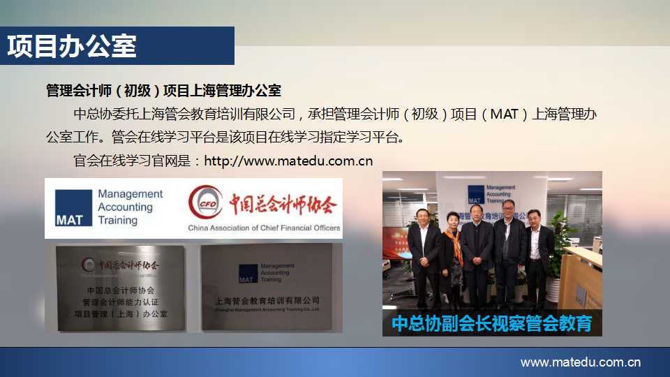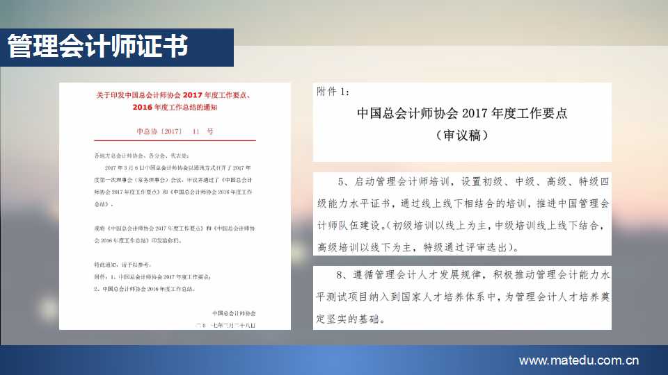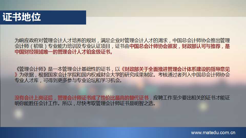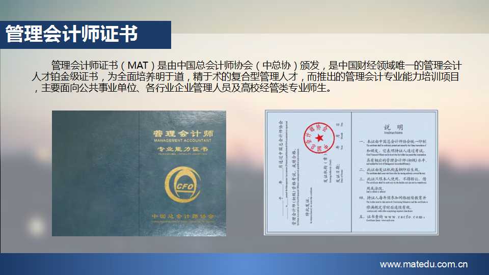 管理會計師證書(MAT)是由中國總會計師協會(中總協)推出,有別于目前社會上的其他財經類證書,它更專注于管理會計人才的培養和發展,既兼顧了英、美國家在管理會計上的理論與實踐成果,又充分考慮了中國特色市場經濟的獨特性,以及中國管理會計所處的階段特征。該證書專注于管理會計人才的培養和發展,能力點覆蓋的范圍包含管理會計的知識、思想、工具、方法論等,側重于預算預測、內部控制、決策支持、風險管理、成本分析等內容,是傳統財務會計進階為管理人員的必要利器。